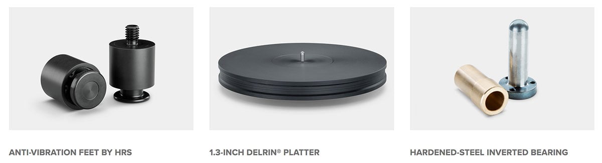 Plinta folosește o combinație de MDF și aluminiu într-un design cu amortizare stratificată. Trei piese de aluminiu sunt pe partea superioară a MDF-ului. Motorul, brațul de pick-up și ansamblul rulmentului sunt fiecare cuplate la una diferită. Acest lucru ajută la izolarea pieselor între ele și împiedică vibrațiile externe să pătrundă în ele. Un design grozav!