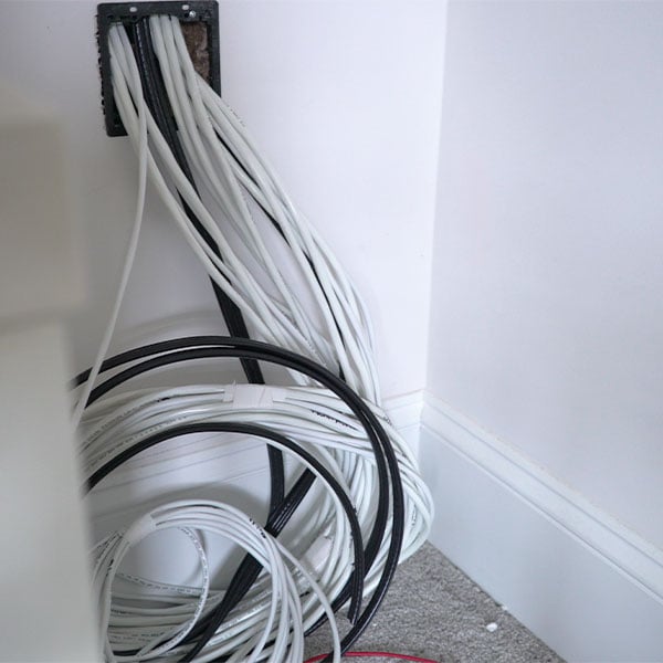Cablurile din interiorul rackului vor avea nevoie de puțin slack, așa cum am discutat mai sus, dar va mai fi un mănunchi de cablu de boxe, unul sau două cabluri HDMI și un cablu ethernet care ies din rack. Ne place să le legăm împreună și să le păstrăm separate de cablurile de alimentare principale, exact cum am făcut în rack. Dacă împingi rackul înapoi într-un spațiu închis, gândește-te la modul în care cablurile care ies din rack se vor îndoi și vor plia pentru a reduce stresul și a le face ușor de tras înapoi atunci când muți rackul.
