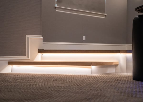 În această cameră, avem lumini principale de tavan ca iluminat de lucru și pentru a umple camera cu lumină puternică de sus. Luminile de lucru sunt aliniate cu boxele Atmos pentru a arăta estetic plăcut. De asemenea, am adăugat iluminat liniar sub fiecare platformă pentru a adăuga un accent camerei, care poate fi lăsat aprins în timpul filmelor pentru a vedea podeaua dacă trebuie să te ridici fără ca lumina să afecteze imaginea de pe ecran.