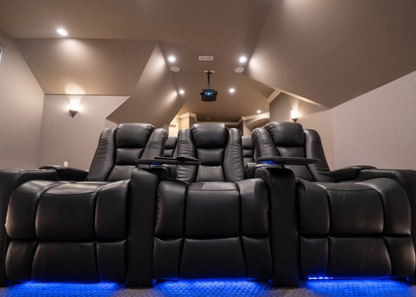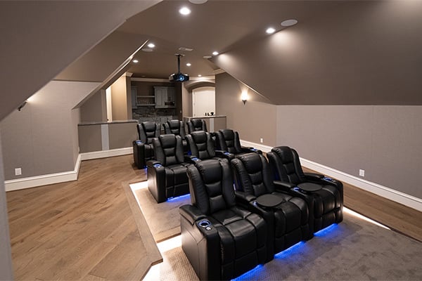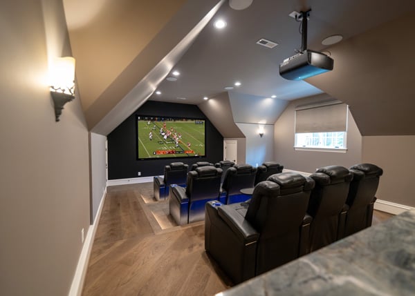 La planificarea acestei camere, am vizitat casa în timpul fazei de construcție. Am avut câteva cerințe esențiale pe care clientul le dorea. În primul rând, având în spate un bar și o zonă de socializare, aveam nevoie de cel mai mare ecran posibil pentru a maximiza vizionarea din orice colț al camerei, chiar dacă nu stai jos. Apoi, trebuiau să fie trei rânduri de scaune de cinema. Și, în final, trebuia să facem această cameră să arate și să sune cât mai bine posibil, având în vedere forma sa ciudată.