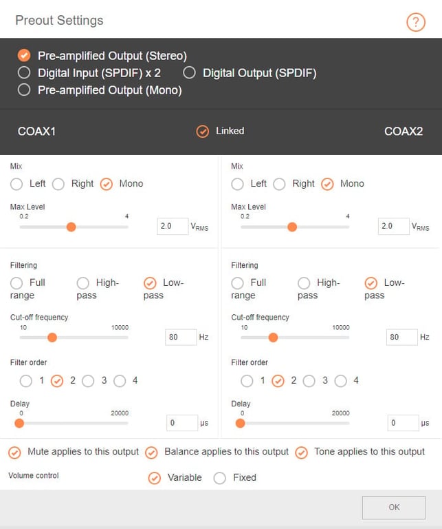 Preferăm mono pentru două subwoofere de asemenea, dar dacă vrei să experimentezi, poți selecta fiecare canal ca stânga și dreapta. Nu adăuga nicio întârziere pentru ieșirile de subwoofer. Asigură-te că PreOut este setat pe Variabil.