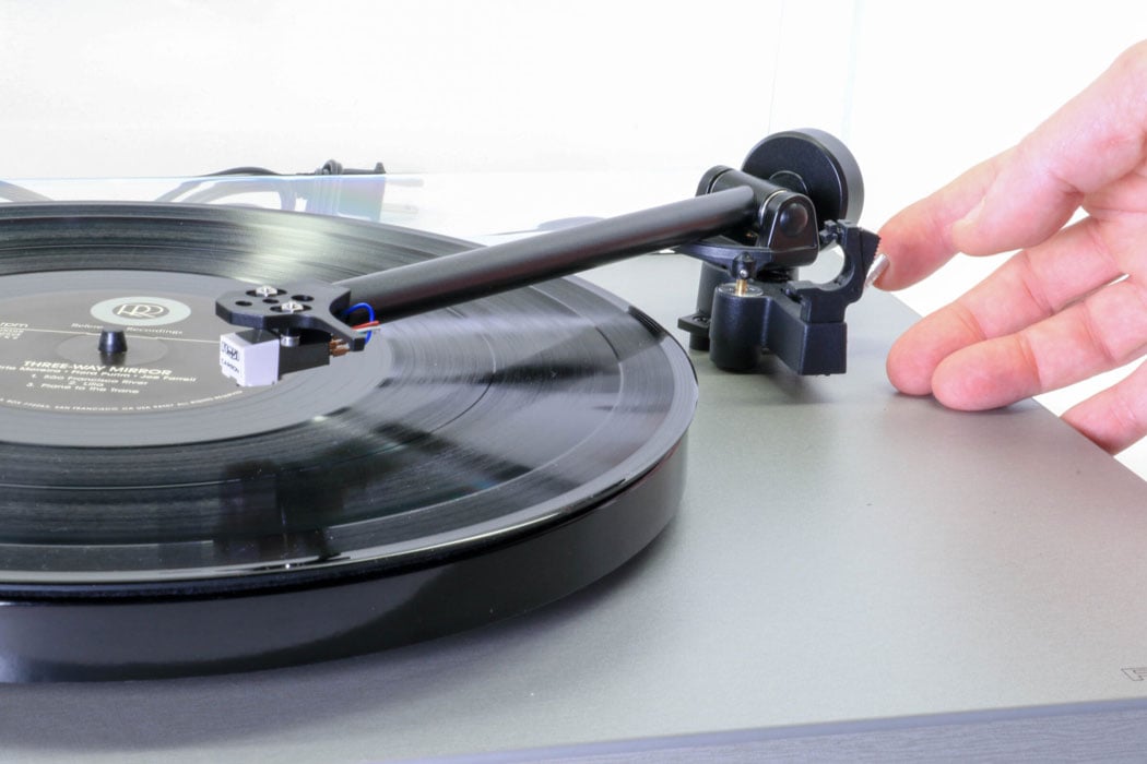 3. Pentru a reda vinilul, coboară pârghia de ridicare astfel încât brațul de ton să aterizeze în canelura de început.
