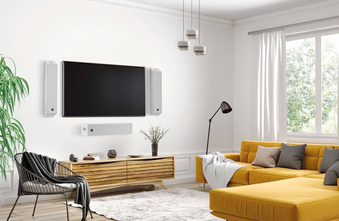 Cu profilul lor subțire, o alegere evidentă ar fi să fie montate pe fiecare parte a unui televizor cu ecran plat, cu una montată orizontal fie deasupra, fie dedesubt pentru un început grozav de sistem de sunet surround. La 3”, s-ar putea să fie mai adânci decât cele mai recente televizoare cu ecran plat subțire chiar și cu suporturile lor, ceea ce înseamnă că există riscul ca imaginea să se reflecte pe marginile unui cabinet lucios. Aici, negrul satinat ar fi probabil cea mai bună alegere, sau ați putea obține un suport TV care să iasă suficient cât să fie la același nivel cu boxele pentru a evita orice reflecție și să folosiți oricare dintre culori.