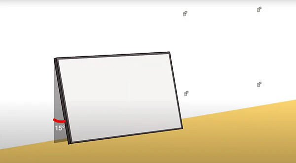 Cu un ajutor, transportați cu grijă ecranul la perete cu eticheta DOWNSIDE în partea de jos și sprijiniți-l de perete la un unghi de 15 grade cu eticheta DOWNSIDE orientată spre perete. (NOTĂ: Dacă instalați ecranul invers, calitatea imaginii va fi afectată.)