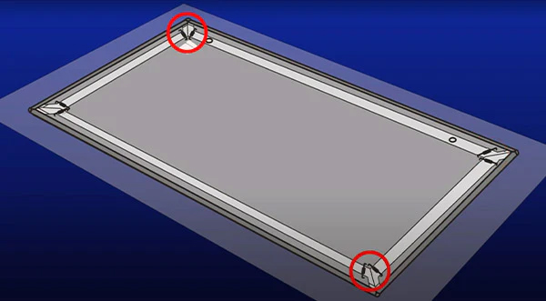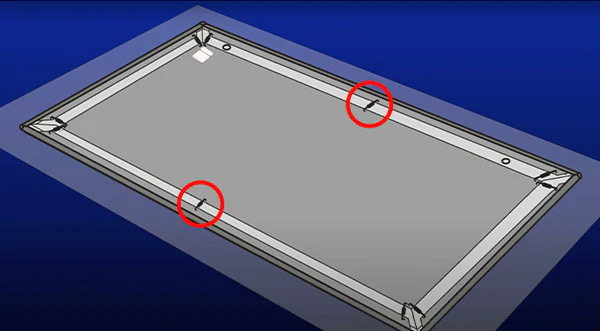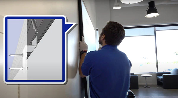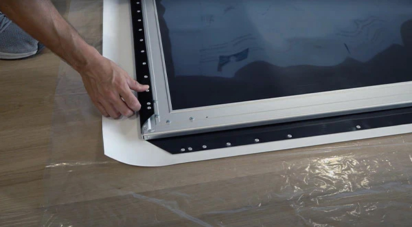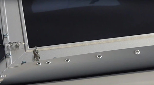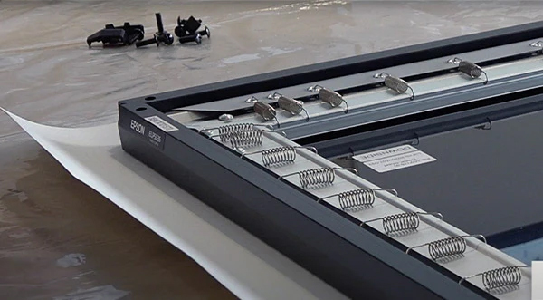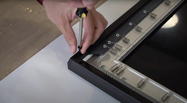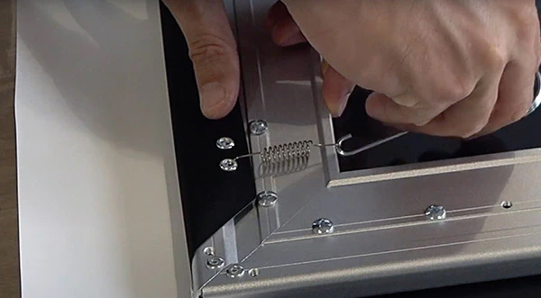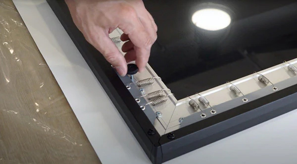 Cu toate resorturile de tensiune atașate, următorul pas este să atașați fiecare margine a cadrului cu finisaj negru pe toate laturile cadrului. Acestea se fixează direct peste fiecare latură a cadrului și a materialului ecranului și apoi se înșurubează pe cadru la fiecare colț.