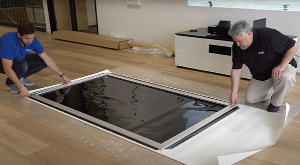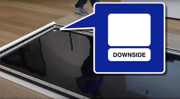 Scoateți materialul ecranului din tub și derulați-l pe folia transparentă. (NOTĂ: Asigurați-vă că partea ecranului cu eticheta “DOWNSIDE” orientată în sus este cea mai apropiată de peretele pe care va fi agățat după ce este derulat.)