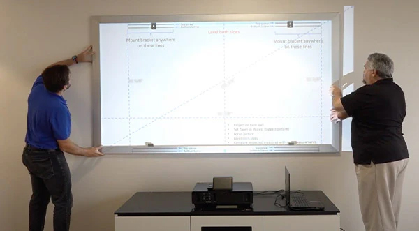 Pentru a vă ajuta să identificați locațiile găurilor pentru suporturile de perete, EPSON a creat o imagine ghid pe care o puteți proiecta pe perete. Descărcați ghidul pentru suporturile de ecran de 100” sau 120”.