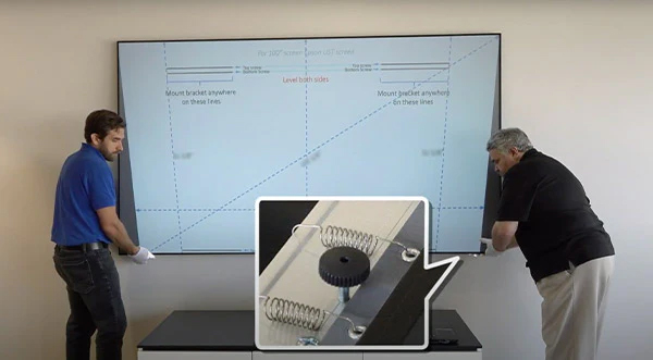 Cu un ajutor, ridicați ecranul menținând unghiul de 15 grade și agățați suporturile de perete în canelurile de la partea de sus a ecranului, apoi coborâți ecranul pe suporturi, sprijinind cu grijă partea de jos a ecranului de perete. (NOTĂ: Suporturile de jos ar trebui să atingă interiorul cadrului și să îl țină împotriva peretelui.)